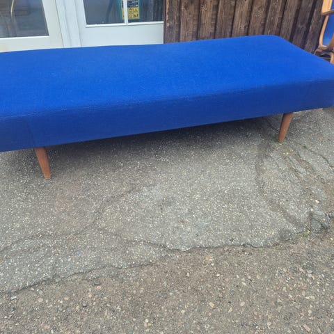 Savbriks, som kan skilles ad og samles uden brug af skruer. Lærredet er ret smadret, da den har været brugt ude. Men træet fejler intet og den er fuldt funktionsdygtig. Man kan sikkert få et nyt lærred til den. Charmerende møbel.