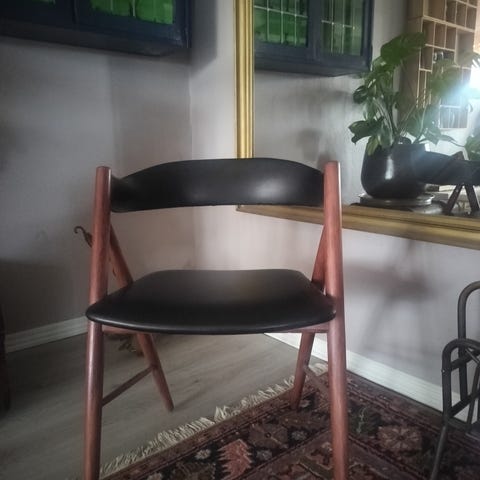 Ny polstret Theodor Frederik Harlev savbukke stol. Stolen er designet i 1958 og produceret fra Farstrup stolefabrik. Stolen er model 205 og udført i teaktræ. Stolen er blevet pudset og fået bivoks. Derudover er der kommet ny polstring i en flot gråmeleret farve, stoffet hedder Camira, Main Line Flax.