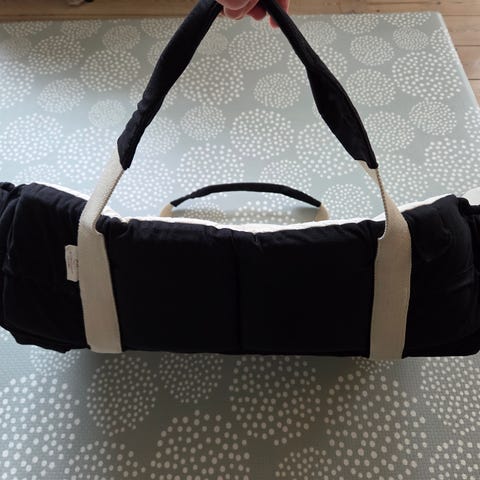 Super smart og funktionel blød babylift med hård bund i sort og beige fra Phil & Teds. Passer fint til barnevogn eller når baby skal bæres ind i hjemmet mm.