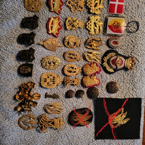 Andre samleobjekter, Regiments mærker, Har denne samling af gamle regiments mærker til salg Samlet pris 1000kr.