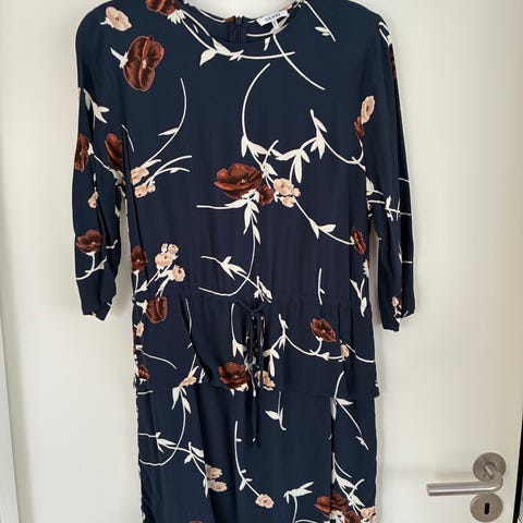 Tætsiddende kjole i elastisk stof med struktur i sort og vlå. Lynlås i ryg. Der står str xl i den men den svarer til en large. Længde