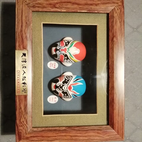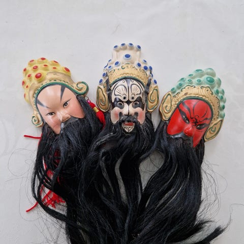 Kinesiske masker, papirklip i silkepapir i kraftige farver. 10 stk. samlet. HELT NYE, har bare ligget i bunden af skuffen i mange år. Jeg havde planer om at indramme dem, men det er ikke blevet. De ligger beskyttet mellem to stykker papir – det er derfor billedet er sløret når du ser dem alle på én gang på fotoet. Papiret måler 32 x 22,5 – det giver et indtryk af størrelsen. Fejler intet.