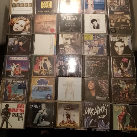 100 vis af cd er sælges. Der er pop , contry rock trance dance mm så spørg gerne om ind hvis du mangler noget bestemt. Priserne varierer lidt men der er fra 2 kr stykket og nogle ganske få der koster mere end 70 kr. Der er ikke taget billeder af dem alle så spørg endelig. Cd er kan afhentes i sønder omme eller sendes. Jeg kan nævne kunstner som Elton john, Poul krebs, d a d , big fat snake, Nick og Jay, Kim Larsen , Rod steward , Gasolin box , Bruce springsteen og tusindvis af andre.