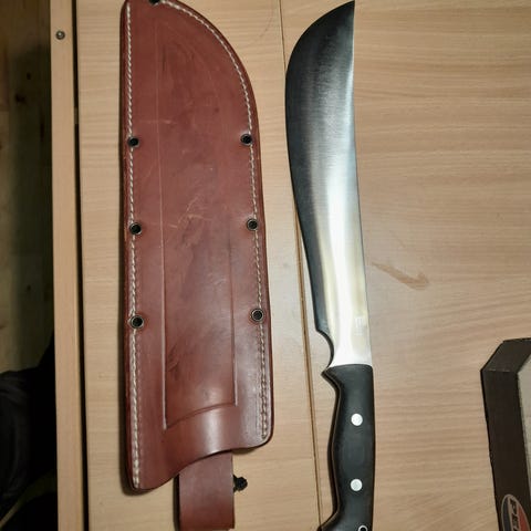 NY KÆMPEKNIV / MACHETTE I DAMASK STÅL MED KRAFTIG SKEDE.