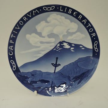 Indsamlingplatte Odd Fellow Ordenen , Royal Copenhagen , 1897, Indsamlingplatte for Odd Fellow Ordenen til fordel for et hospital for spedalske på Island i 1897, designet af Arnold Krog. Oplag 1.500 eksemplarer. Dia 19 cm