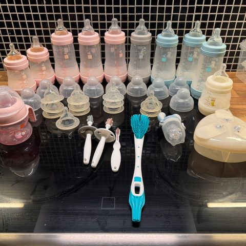 Flaskerne har den funktion, at de trækker luft ind ad bunden når baby drikker, så det er nemmere for baby at drikke. Sælges samlet.