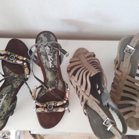 1. ALDO, stilletter. brun, str. 37. Brugt. Lidt ridser på hæl. Pude i indersålen så blød at gå i. Hælhøjde 10 cm. kr. 80