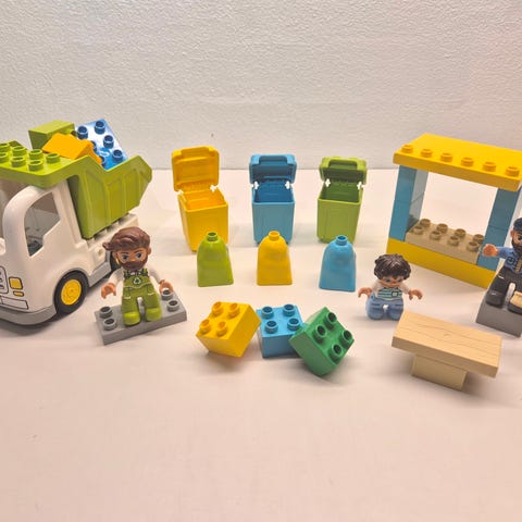 Duplo skraldevogn og skraldemand. Vognen kan kobles på andre køretøjer. Figurens hænder har synlige brugsspor/slidmærker, men jeg kan ikke fange dem med mit kamera.