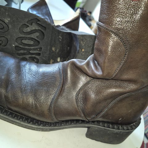 Brugt få gange, ingen skrammer eller ridser ingen mangler af nitter. De er så fine, og behagelige at have på.