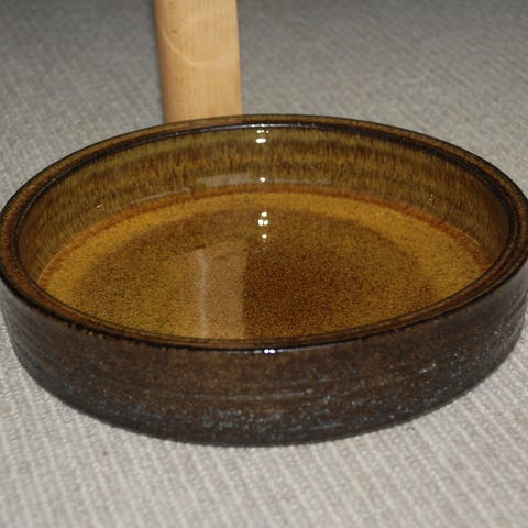 Lille fad i stentøj, glaseret, i en smuk blå/grønne farver. Fejlfri.