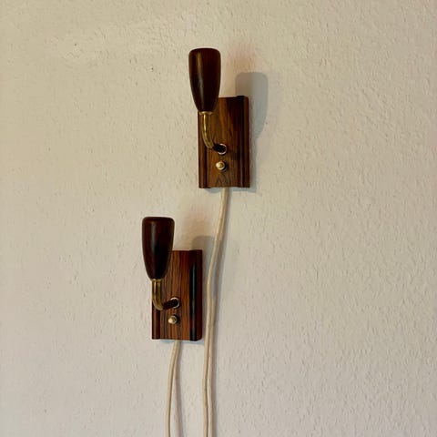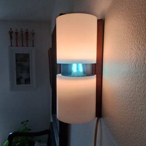 I teaktræ og stål. Skærm med stof, ca. 15 cm. i diameter.