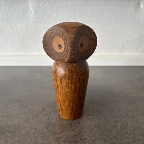 UGLE i træ smoked ,16 cm høj i æske , hoved kan flyttes så den får forskelligt udtryk