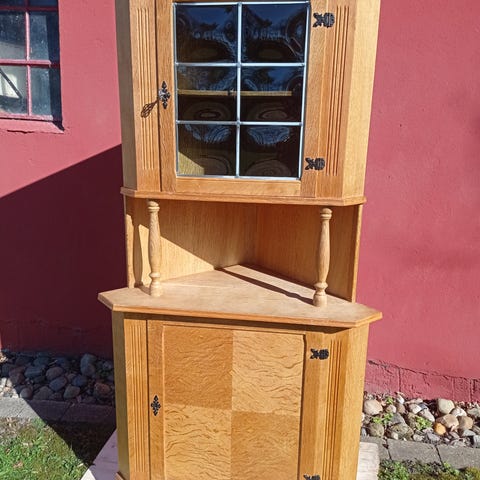 Hjørneskab, Flot hjørneskab i egetræ med 2 låger, hvor den ene har blyfarvet glas.