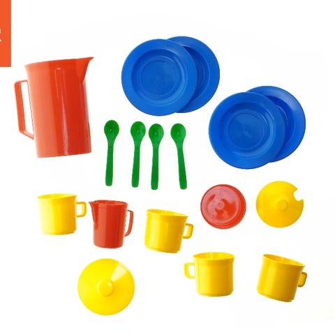 Fint lille tesæt, som inkluderer 4 tallerkener, 4 skeer, 4 tekopper med underkopper, 1 tekande med låg, 1 serveringsbakke samt en kage med lys i træ, som kan deles i fire stykker.