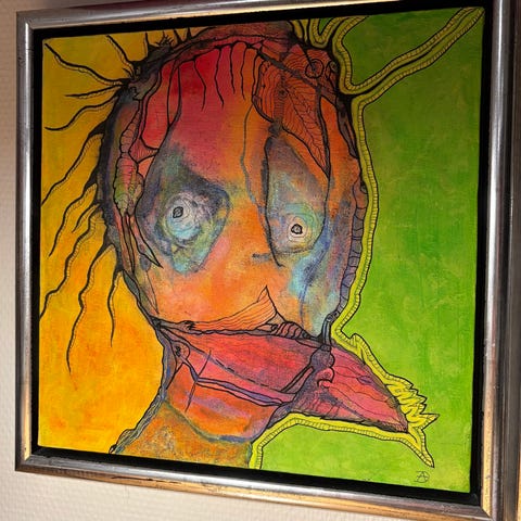 Akrylmaleri, Kathe Detlefs, motiv: Abstrakt, stil: Abstrakt, “Lille grøn hund!” Maleriet måler 80x80 og gemmer på mange overraskelser hvis man giver sig tid til at betragte det i fred og ro.