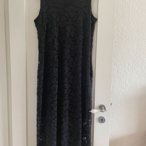 Mørkegrå blondekjole med dyb ryg, lynlås i ryggen og 3/4 ærmer.