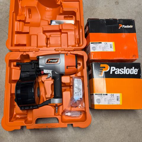 Paslode trommelpistol sælges incl 1 kasse 50 mm og 1 kasse 65 mm trommelsøm. Kan også få to af samme slags