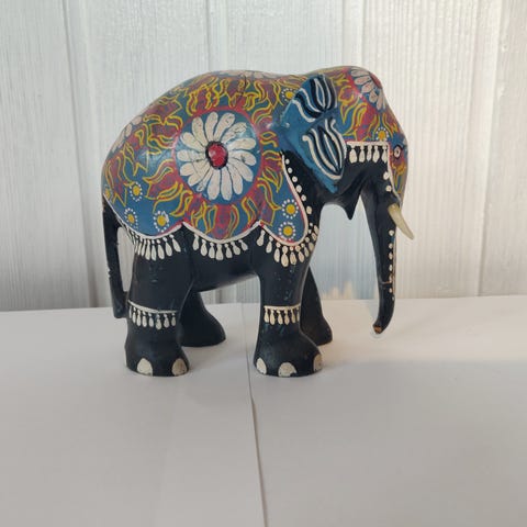 Elefantidolet filigran håndskåret af træ, et mesterværk, der kombinerer kunst og kulturel indisk rigdom. Figur udskåret med håndværkerens præcision og dygtighed,