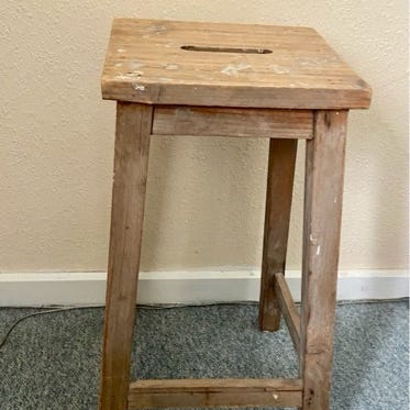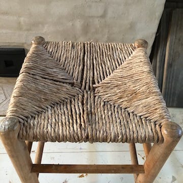 Gammel skammel i træ med flet på sædet. Fransk stil.