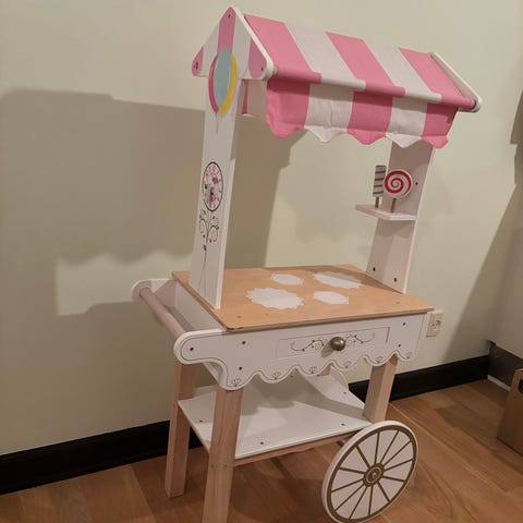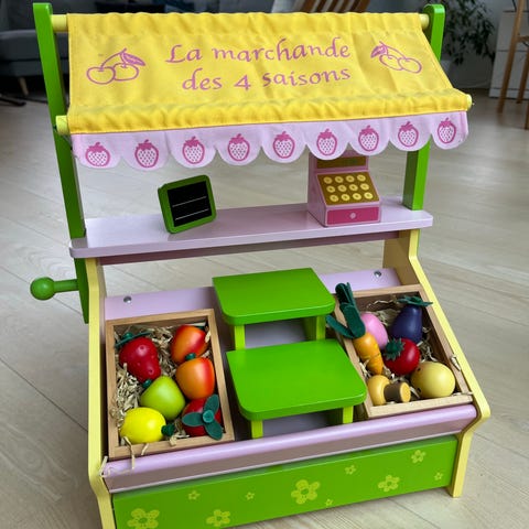 Den fineste legekagebod købt i Karrusella- nypris ca 1500 danske kroner. Børnene har leget fantastisk godt med denne fine kagebod. Den er helt i træ og med stribet stof markise.