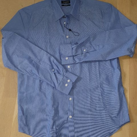 Skjorte, Manfield, str. 43-44, str. XL, Stribet sort/blå, Ubrugt, Langærmet, stribet skjorte, i str. XL-43/44 og hel nye