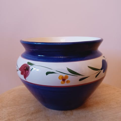 Retro krukke / urtepotte / potteskjuler med hvidt mønster, i fin stand. Mål: ca højde 10,5, diameter 14