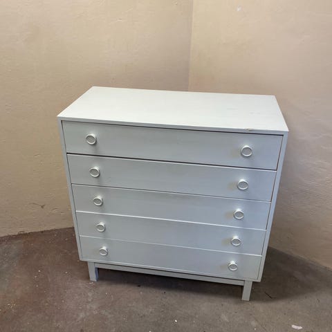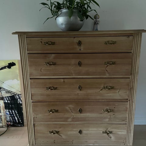 Dansk snedkerkommode med messinghåndtag og skuffelåse