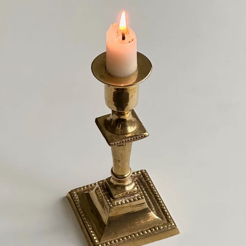Messingstage fremstillet hos gørtler H. P. Iversen i Hjørring. H: 8cm. Fod Ø: 12 cm. Vægt 840 g.