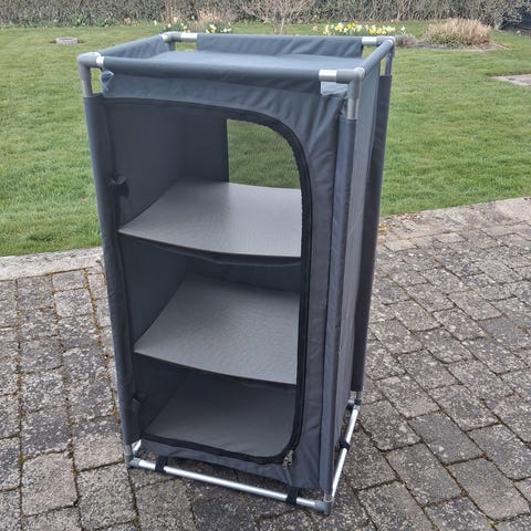Sammenklappelig campingreol med 3 hylder og topplade. Rigtig pæn stand. højde91 cm, brede 53,5 cm, dybde 53,5 cm.. Taske medfølger. God kraftig kvalitet.
