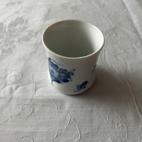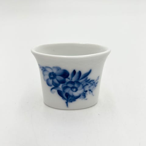 Bæger, blå blomst fra Royal Copenhagen. H 5,5 cm. Ingen skår men lidt ujævnheder i glasuren, nr. 8566