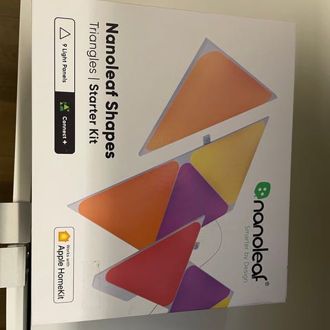 Sælger min Nanoleaf Shapes Starter Pack med 9 paneler. De har været brugt før, og klisteret fra vægopsætningen sidder stadig på, men kan nok ikke genbruges – nye klæbepuder kan dog købes separat.