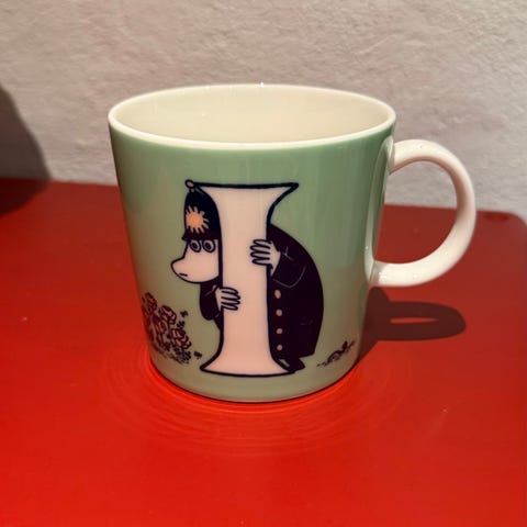 2 stk mumikopper i æske. ABC Snufkin og ABC Moomintroll. Et samlet sæt med de to forskellige kopper. Special edition 2022 i forbindelse med Røde Kors.
