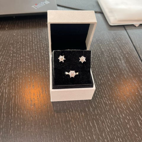Keis Guldsmed har lavet fingerring og ørestikkere i 14 karat hvidguld med samme total 0,35 ct og der er sat en zirkone i midten af fingerringen der kan udskiftes til en brillant.