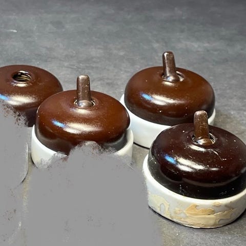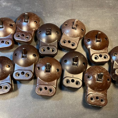 Retro, Antik, afbryder i porcelæn, brun og mørkebrun bakelit, LK tumbler