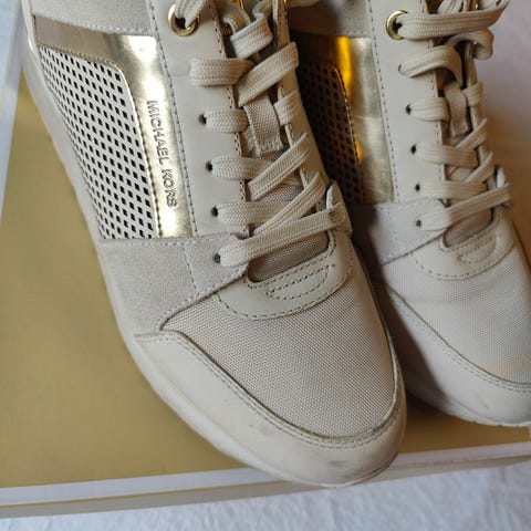 Denne nye læder besatte sneaker fra Michael Kors er stænket med dens metalliske Empire-monogram og er sat på en plateaukile for masser af løft. De passer lige så nemt sammen med luftige kjoler, som de gør med din yndlings denim. Bemærk farve er sort/sølv . Nedsat pris. Str.40-40,5.