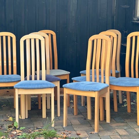 Sælger disse fire sjældne prototype-spisestuestole, som formentlig stammer fra Findahls Møbelfabrik i 1970’erne/80’erne. De har et markant retrolook med mørkt bejdset træstel og originalt orange/stribet betræk. Stolene er brugte med synlig slitage på betrækket, men stadig solide og fuldt funktionsdygtige. Stolene trænger til at blive ombetrukket, da der er slidt hul i betrækket. Sælges med brugsspor.
