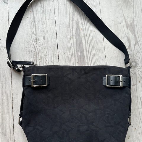 DKNY Stof Taske til Kvinder i sort farve. Tasken har justerbar skulderrem og metalspænde foran. Der medfølger en mindre pung i samme materiale og farve med lynlås. Tasken har tydelige brugsspor.