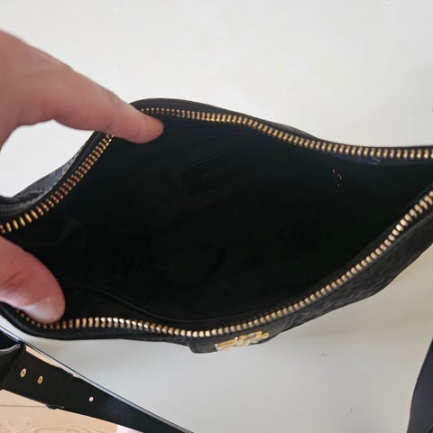 Sort/hvid stribe med gulddetaljer - viser tegn på brug i lynlåsen og remmen. Meget rummelig