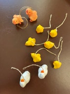 Dekorative gammelt påskepynt med ophæng. De måler mellem ca 3-4 cm. Den ene orange kylling har et afslag på vingen, den ene hvide and på næb og bag til.
