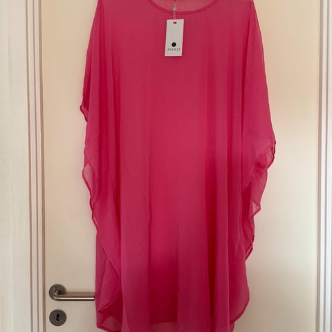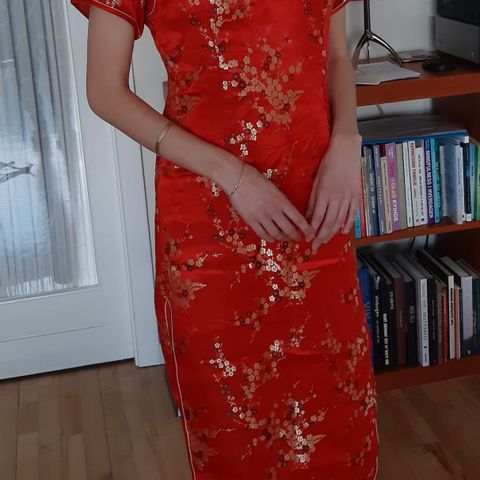 Næsten som ny, Lang vest eller kort kjole i det skønneste kinesiske, changerende stof med roser. Kantet med (fake) pels og lukkes med kinesiske “knapper”. Brugt, men som ny. Skal ses!
