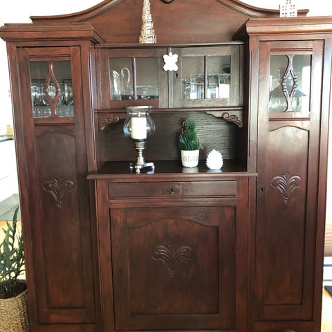 Ældre fin buffet vitrinskab med detaljer. I rigtig god stand og skabsglassene er hele og indtagte..