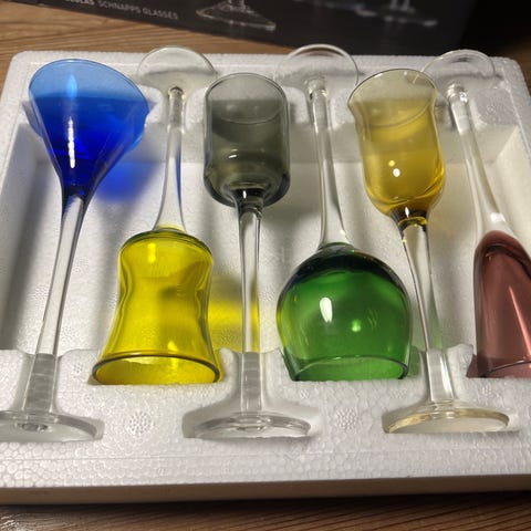 Lyngby glas snapseglas i blå, som ses på billederne.
