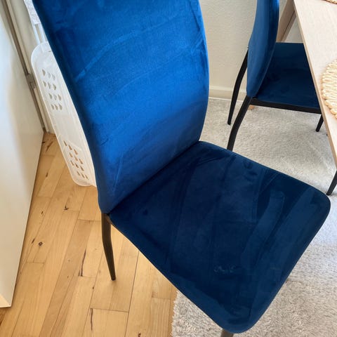 Fire spisebordsstole i lysegrå velour med lyse træben. Stolene har været brugt og trænger nogle steder til en rengøring samt forekommer mindre fejl hist og her efter brug. Sælges derfor meget billigt til 300,- for alle fire stole.