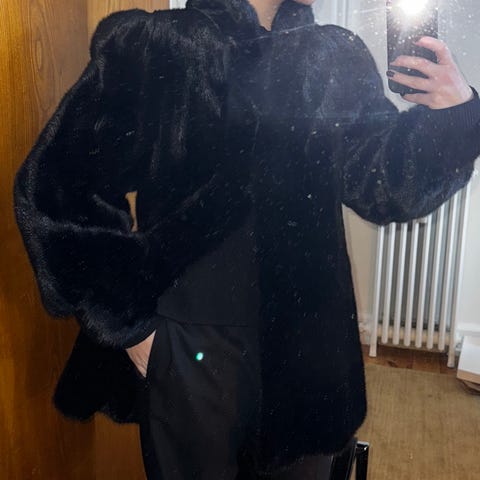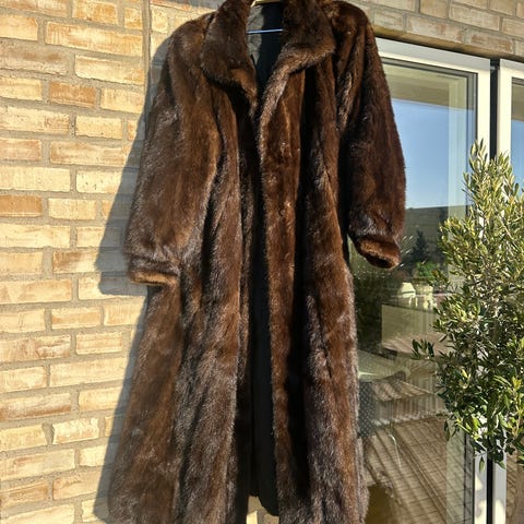 Jeg har arvet to mink frakker, dette er den ene af dem. Meget blød og fin men ved lommen er den i stykker. Ses på det andet billede, på det tredie billede kan man se at det kan ‘gemmes’.