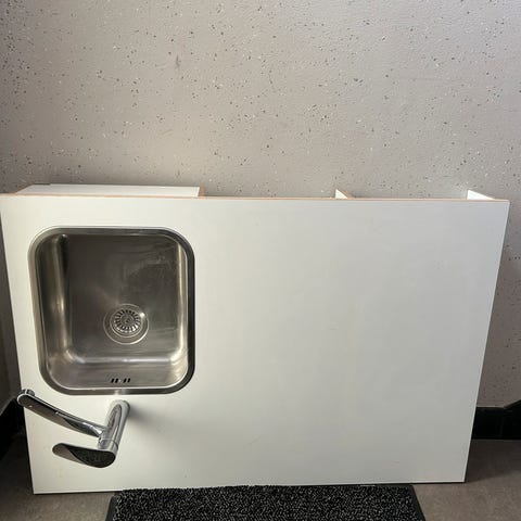 Nedfældet vask i højre side. Et grebs blandingsbatteri. To gode tråd skuffer.