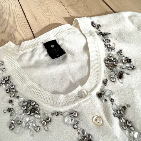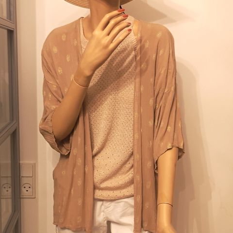Helt ny let cardigan med korte ærmer i hvid med guld prikker. Onesize. Fra De Lux Skagen. Kan sendes.