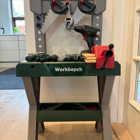 Grønt Bosch værksted bord med skruestik, skruemaskine og diverse værktøj. Alt på billedet indgår