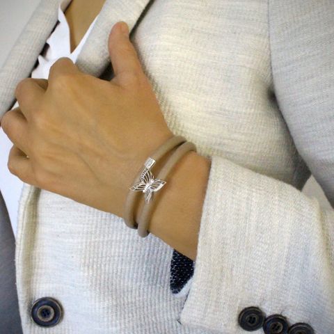 Fint læderarmbånd med magnetlås fra Dige Designs. Armbåndet er lavet i ægte Taupe-farvet nappa læder, som er dekoreret med glimtende Swarov... krystaller