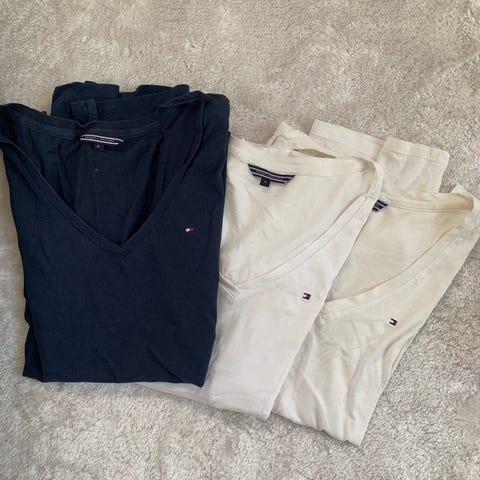 Stribet Tommy Hilfiger T-shirt i mørkeblå og rød. lyseblå lomme med sølv metal logo