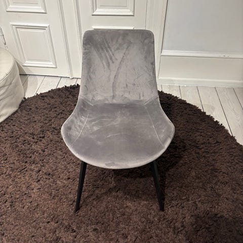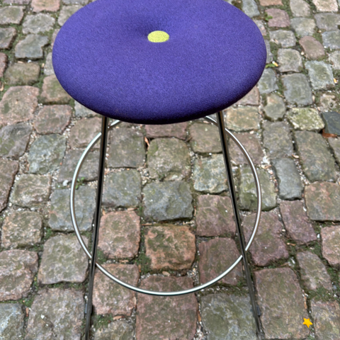 Super fin Design By Us Stol i mørkegrøn med lillafarvet knap og stålben. Størrelsen er Ø30 x H63 x W42 cm. Købspris DKK 3090 - NU DKK 700.